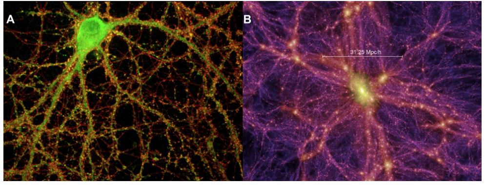 The A image is a brain cell, a neuron, and the B image is a cluster of galaxies, (the cosmic web of light). The universe is scaled in repeating patterns. Knowing how magnificent our brains are, the ultimate organic divine technology, who would ever want a cheap imitation computer chip implanted?