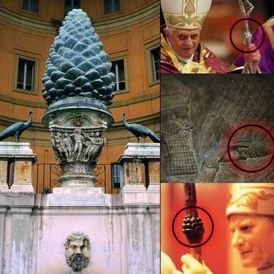 The pope carries a staff that has a pine cone on it, and a giant pine cone sits in the Vatican. It is also shown in the hands of the ancient Sumerian kings, and I believe it represents the pineal gland.